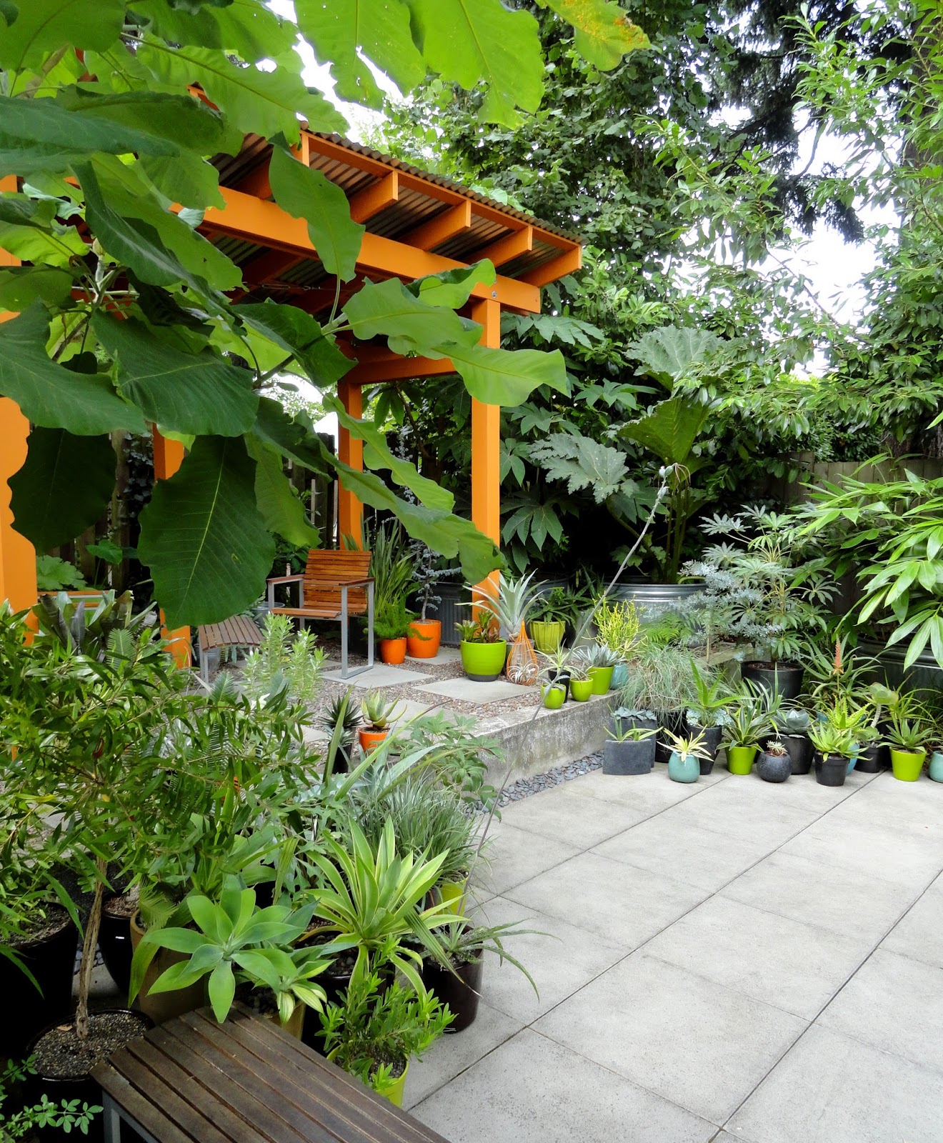 Those large bright green leaves to the left of the orange circle pot belong to Bocconia frutescens (Tree Poppy).